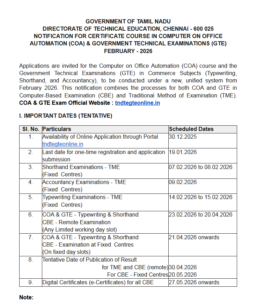 Based on the official notification from the Government of Tamil Nadu Directorate of Technical Education, here is the comprehensive information regarding the February 2026 Certificate Course in Computer on Office Automation (COA) and Government Technical Examinations (GTE).